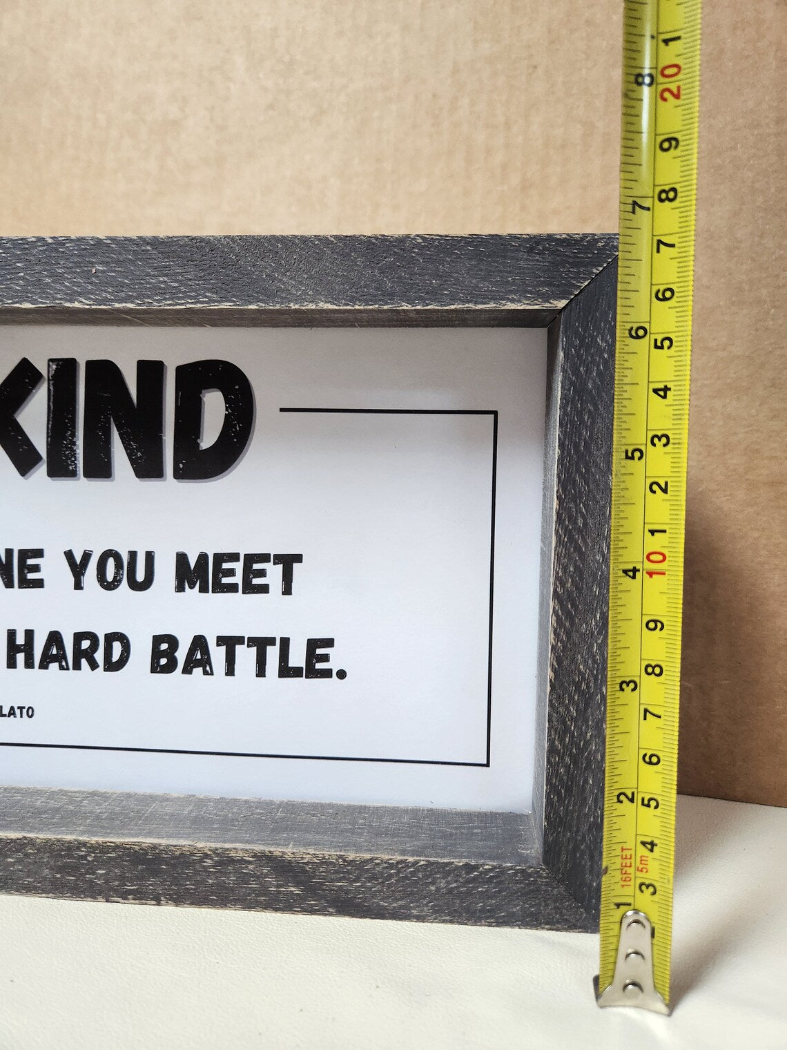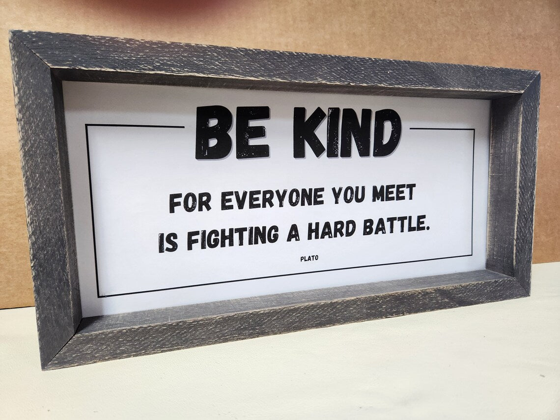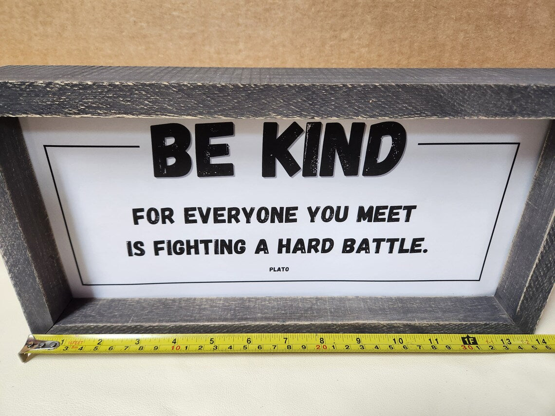 Be Kind for everyone you meet is fighting a hard battle verse by Plato is framed in a rustic gray washed wood frame. A eye catching reminder to think about kindness. Size is 6 3/4" X 14" The depth is approx. 2" and looks great on a shelf, counter, end table or niche. A perfect addition to the workplace, home, office, classroom and dorm.