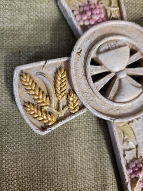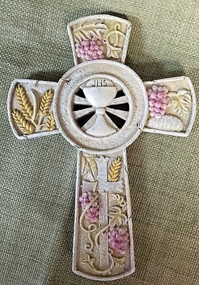 This beautiful First Communion wall cross will make a perfect gift for a special occasion. Crafted of resin, this cross features wheat, grapes and a chalice, perfect for symbolizing the body and blood of Jesus. Measures 10" high.