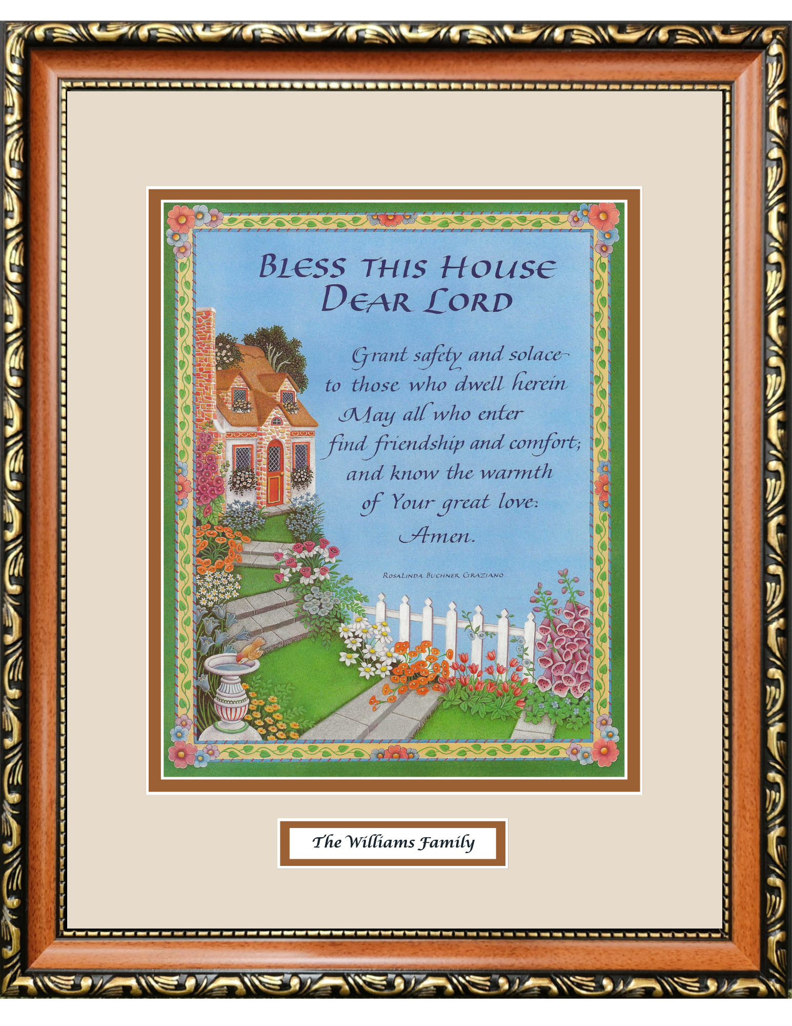 Create a warm and welcoming atmosphere in your home with this custom-framed House Blessing picture. Personalize it with your family name to make it uniquely yours, offering a daily reminder of love, protection, and togetherness. Select your frame and enhance any décor, making it a meaningful gift or a cherished keepsake for your loved ones. The size measures approximately 13" x 17" from the outermost edges of the frame. Complete with glass, hook, and dust cover.
