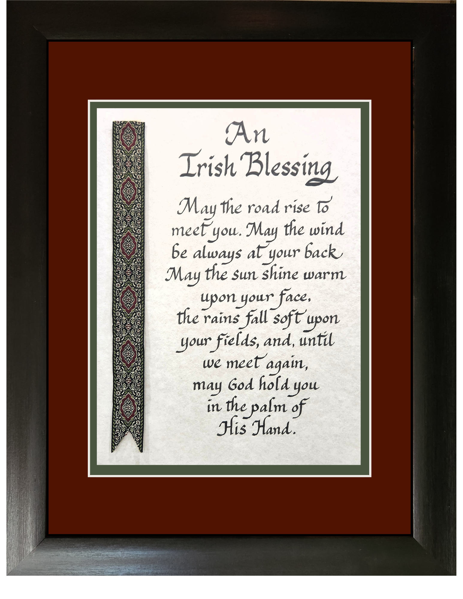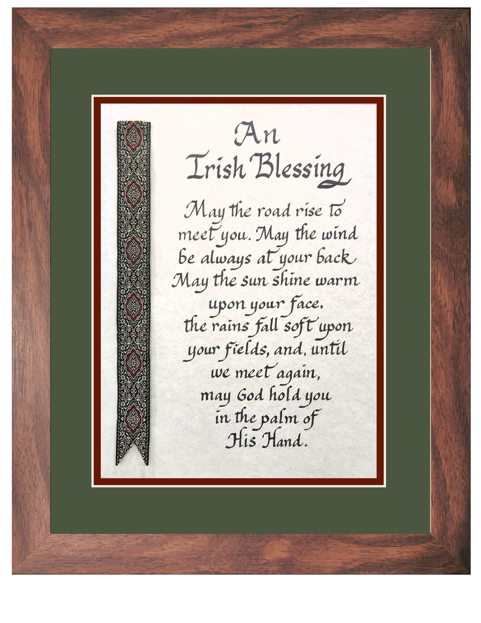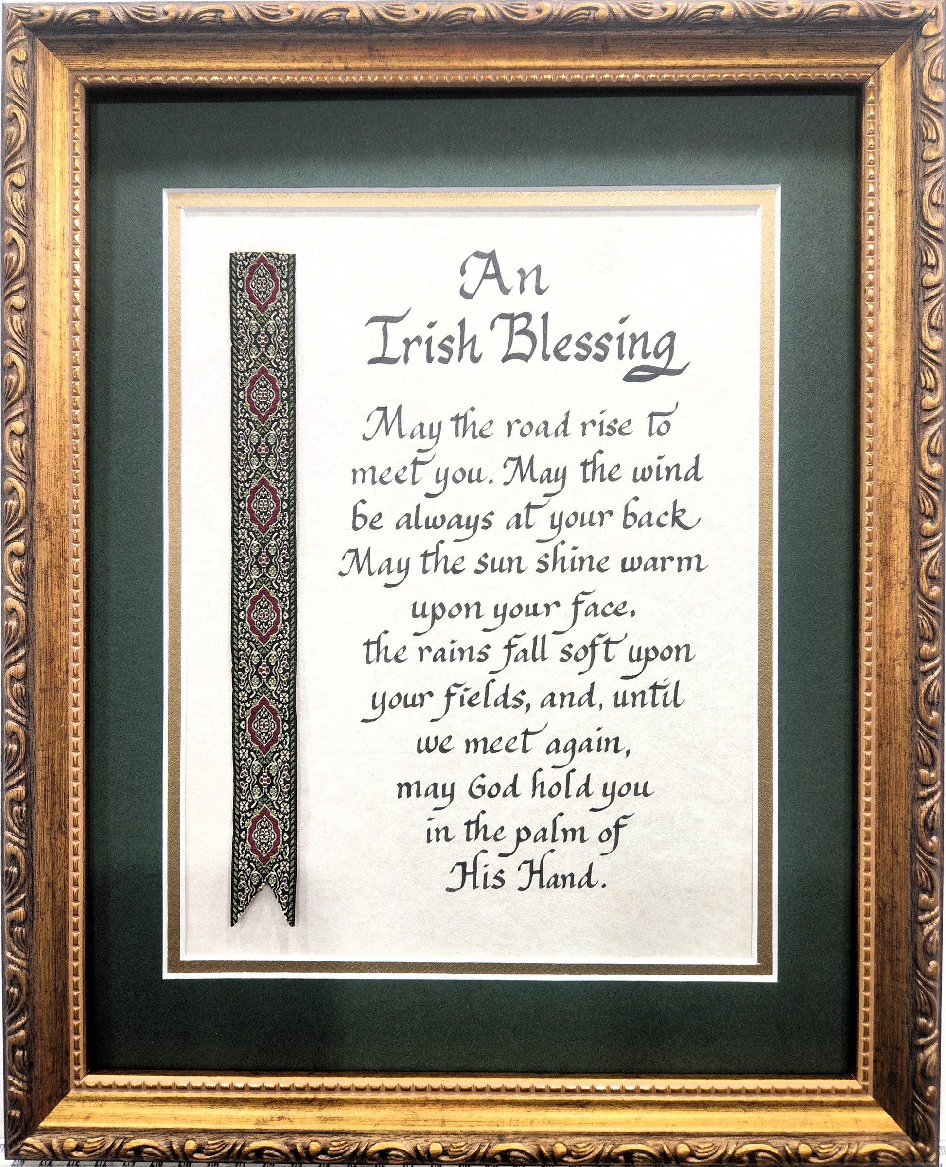Celebrate your heritage with this beautiful Irish Blessing print, featuring elegant decorative ribbon detailing and personalized touches. Measuring approximately 13" x 16", it's the perfect size for any room in your home. Choose from multiple frame and mat combinations to match your décor style and create a truly custom piece. Whether displayed in a living room, bedroom, or entryway, this meaningful artwork serves as a daily reminder of cherished Irish traditions and blessings. A thoughtful gift for yourself or someone special who treasures their Irish roots.