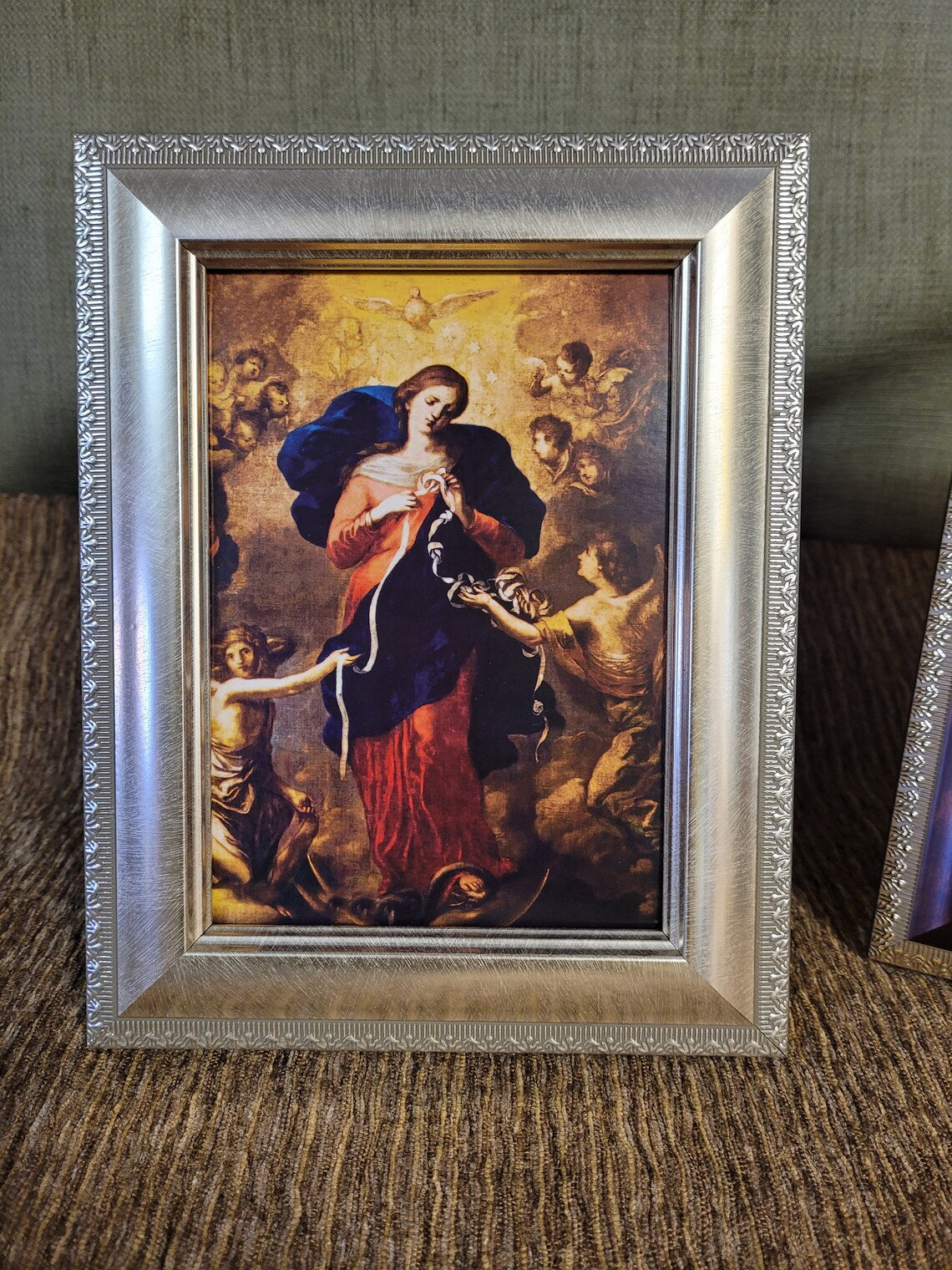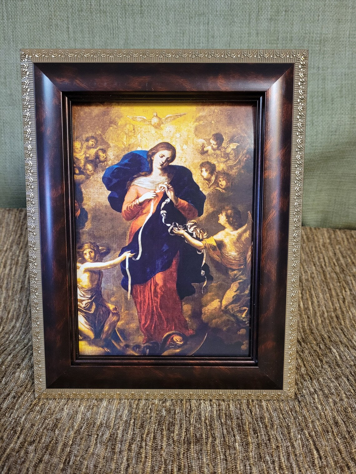 The theology of Mary untying knots goes back to the second century and was understood as Mary untying the knot of sin and disobedience created by Eve. A beautiful devotion to Mary to help us with our own knots that need untying. Two frame colors. Glass and an easel on the back make this ready to display and enjoy. Rich colors and a meaningful depiction of Mary Undoer of Knots. The size of the framed print is 7" X 9"