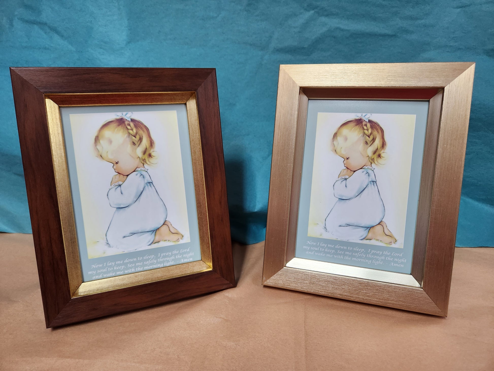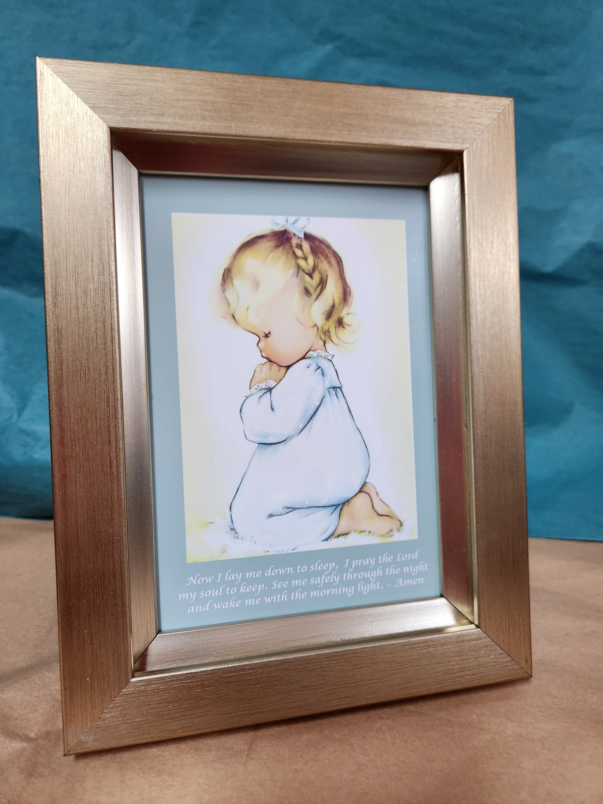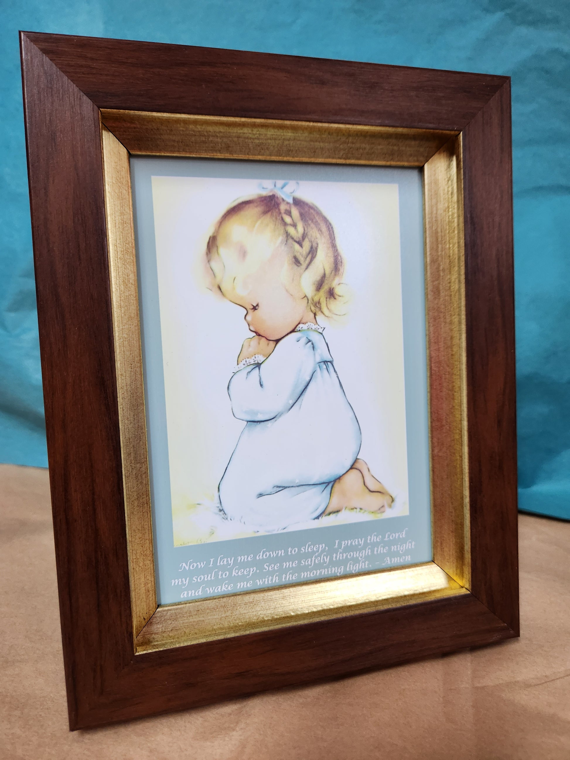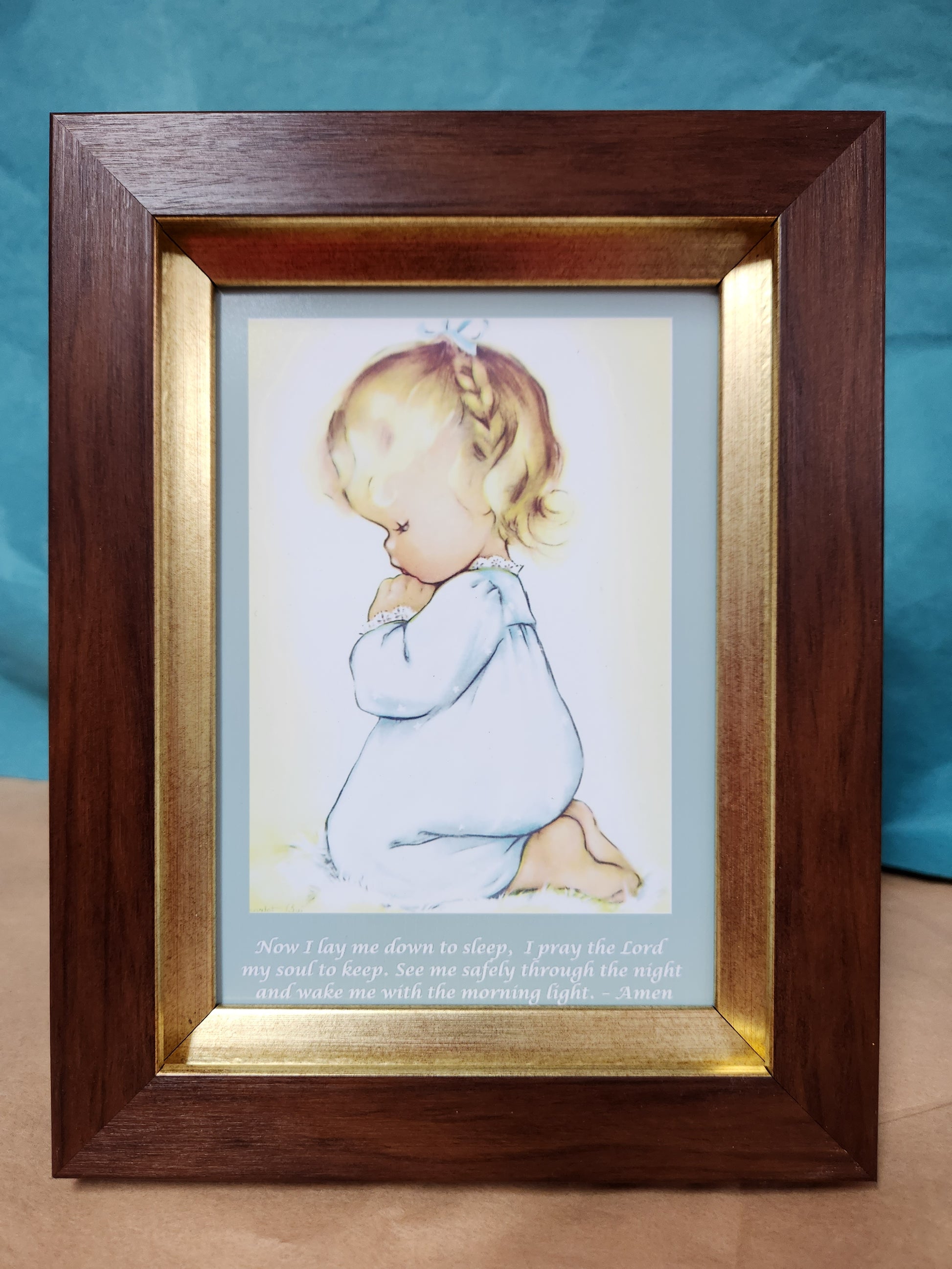 This beautifully framed prayer of a little girl kneeling praying the well-known child's nighttime prayer: Now I lay me down to sleep. Its inspiring imagery will bring hope and peace to any living space. Take a moment to be still and remember the power of prayer. Especially of a child. Two frame choices. One frame is pecan colored with a shiny brushed gold liner and the other is a warm silver color. An easel on the back makes this easy to display on a shelf, nightstand or desk. Overall size from the outside edges of the frame is 7" X 9"