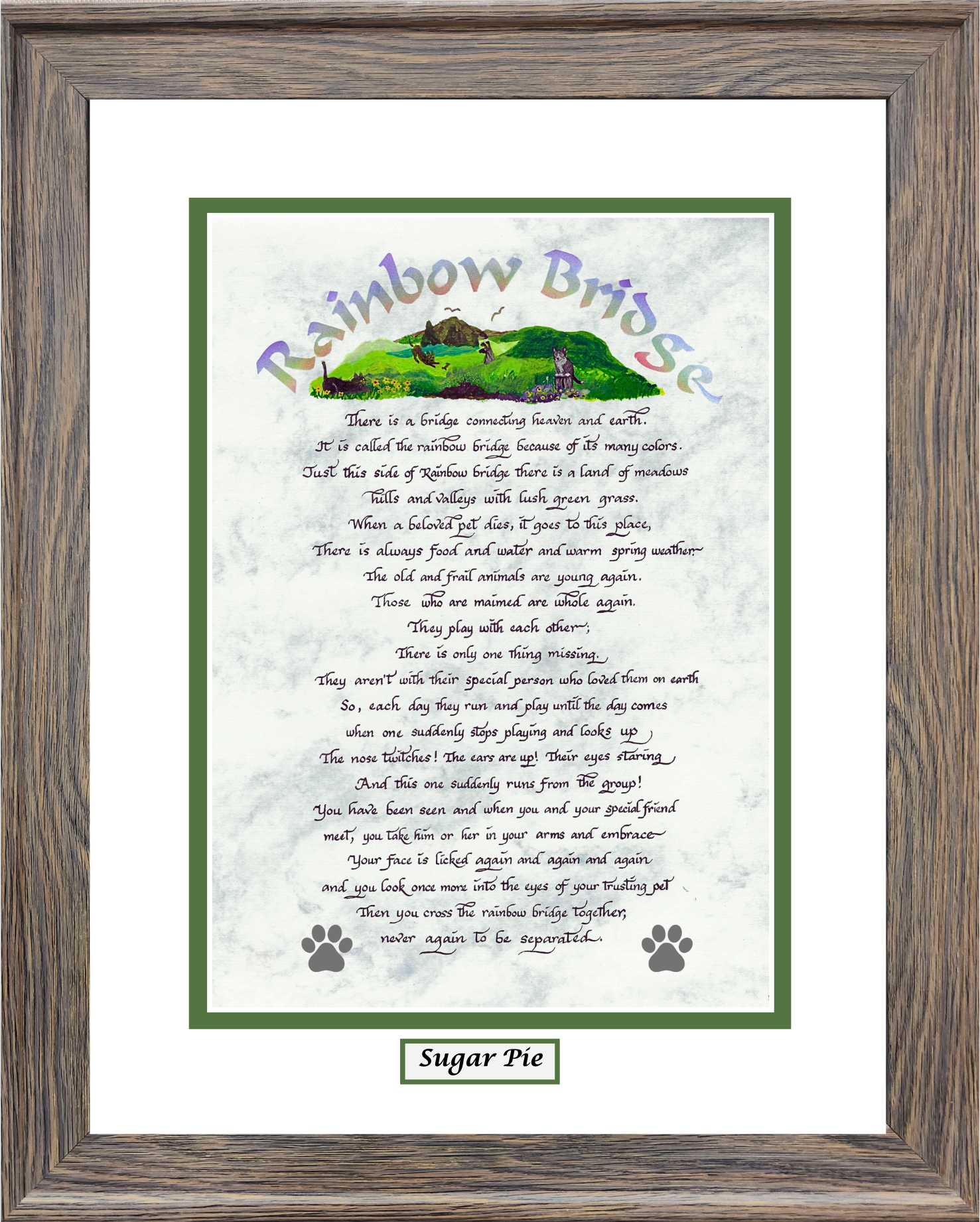 Honor your beloved pet with this Rainbow Bridge framed poem. This heartfelt memorial includes the well-known rainbow bridge poem to commemorate the life of your pet with sympathy and understanding. A meaningful tribute to your friend. A nice gift idea also. Personalization is available to make this picture even more special.